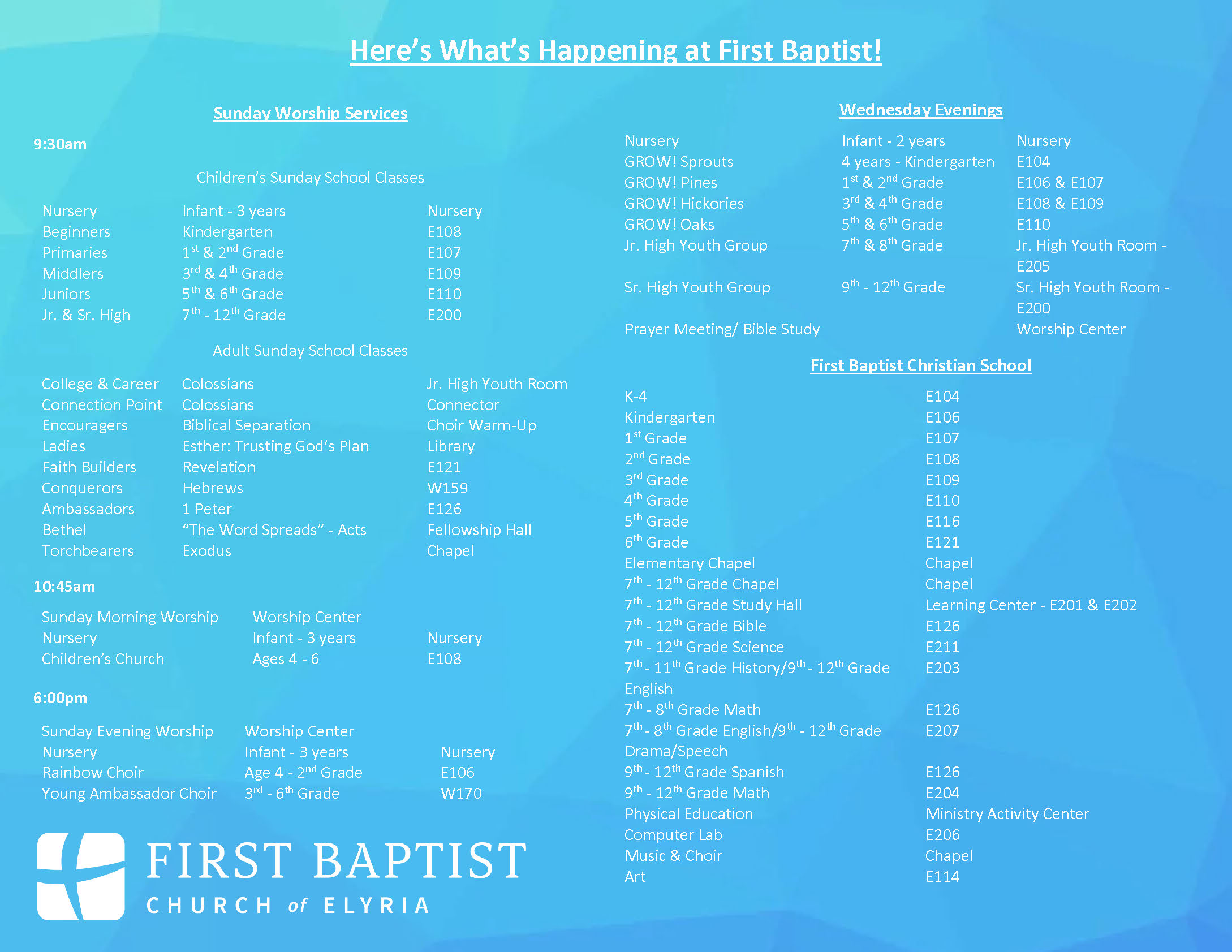 At First Baptist Church, our Sunday morning services emphasize the goodness of God and the hope of salvation. We have ministries for all ages, with childcare and programs for each member of your family. No matter which service you attend, you can be sure you will have an inspirational experience.